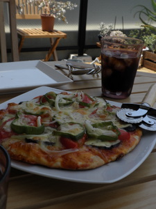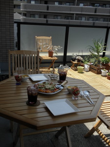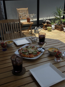 週末・・・ とうとう我が家に・・・ あの・・・ 憧れの・・ ガーデンテーブルセットがやってきました 早速、二人で ピザランチです♪ まだパラソルがないので、日陰の方にテーブルをよせてランチ開始! 本日のメニュー紹介! ピザ ①枚目は、ナス・玉ねぎ・ピーマン・トマトのベジピザ♪ ②枚目は、じゃがめんたい・ウィンナーピザ♪(写真なし!) にんじんスープ (またまた牛乳で作ってみました) トマト・きゅうりのカクテルバジリーナ♪(なんじゃそりゃ) ちょっと近付いてみましょう。 ピザは二回目の挑戦で、うーん。まだまだです。 飲み物は、スタバのコーヒー! 初めてのベランダガーデンでのランチ♪ 天気もよかったし、楽しかった~ 終止にっこにこ