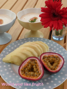 まあ、気にしない。気にしない。 さー食べよう!と思ったところで メニュー書いてなーい ということで、おあずけ状態で 黒板にメニューを書き書き・・ 本日のランチメニューはこちら! 昨日の夜ご飯が、豚カツだったので、その残りで 作ってみました~♪ 最近お気に入りのスープも一緒に。 メニューも書いて『いただきまーす!』 となるところが、 音楽!音楽! ということで・・・ 慌てて音楽をセット。 なかなかランチ食べれず。 小野リサ様のボサノバが軽快に流れて 今度こそランチスタート! ところが、なんだかやりすぎてて、 二人とも恥ずかしくなってきて笑いがでました。 いやーはっきり言って、 パーフェクトですな。 笑 旦那くんの↓ 私の↓ カツの大きさが全然違うでしょ。笑 そして私のは、かわいいのを下に敷いてます 独身の頃に買ったので、まだ一つだけ。もう一つ買わないとね~♪ ランチの後は・・・ ひこたん&みーたんからの奄美大島のお土産! パッションフルーツを頂きました~ 甘酸っぱい味と香りに包まれて幸せ~♪ りんごと、オレンジのヨーグルトも一緒にね♪ あーおいしかった。 ひこたん、みーたんありがとー