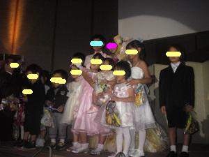 いとこのお子ちゃま達も前に大集合。 和む一時でした そして、披露宴も架橋に入り、 二人で、こっそり計画していたことを実行しました。 今回の披露宴を担当してくれたのは、 元同僚であり、親友である、しのこ。 今回、忙しい中で、自分も出席する披露宴を担当してくれて 色々アドバイスをくれて・・ そんなしのこちゃんにお礼のお手紙を書いて 司会の方に読んでもらい、壇上で花束贈呈をしました。 手紙の内容は、 入社したばかりで、二人で怒られたこと。 私が23歳の時、会社を辞めてオーストラリアに行く時に、 経由地のシンガポールまでついてきてくれて そこで二人で一泊して、涙のお別れ。 1年後は、帰りの経由地の香港までお迎えにきてくれて・・ そんな思い出話と、感謝の気持ちを伝えました。 絶対、感動で泣かせてやる~!! というのが私の密かな目標で・・・ バッチリ果たしました