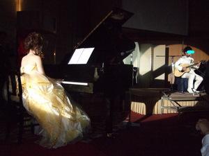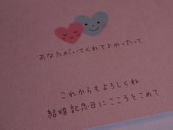 会場に入場した時に、 しのこが、 『やってくれたな~』って顔で リンゴを持ってこっちを見て笑ってたので、 二人で大爆笑しました。 大成功 そして、そして、その次に待っていたのは・・・ 新郎クンからのサプライズで、 私に宛てた手紙でした。 以前、プロポーズされた時に、お礼で私がお手紙を書きました。 その後、 『ねーねー、返事は???』 ってずーっとしつこく言ってて 一向に書いてくれなくって、 結婚式前日も 『そう言えば返事もらってなーい』 って言ってたのに・・ 司会者の方が代読してくれて、 恥ずかしがりやなのに、ちょっぴり恥ずかしいことも書いてあって、 でもとっても嬉しい私の宝物になりました 本当に思いがけず、嬉しかった。ありがとう~ そして、3つめのサプライズは、 私と、新郎クンの演奏です。 新郎クンは普段からギターをしているわけでもなく、 私も昔習っていただけで、最近は全然演奏していなく 下手っぴになっていて苦労しました。。 何よりも二人で時間を合わせて練習するのが大変で 小さなスタジオを借りて仕事帰りなどに 時々練習してました。 曲は『歌うたいのバラッド』 とっても大好きな曲です。